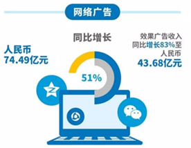 2015年1月25日,微信朋友圈以寶馬、vivo和可口可樂三支品牌廣告為號角,隨后的2015年第二、三、四季度中,效果廣告收入分別為20.57億元、23.86億元和29.16億元,同比增長速度分別為196%、160%和157%,全年下來,受益于效果廣告收入同比172%的增幅,也帶動了騰訊在網(wǎng)絡(luò)廣告業(yè)務(wù)上的增長幅度過百。而今年第二季度、第三季度,效果廣告仍舊分別維持著80%、83%的高增長。
