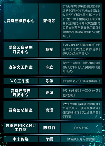 過去一年多時間里,愛奇藝在版權(quán)和自制內(nèi)容運(yùn)營商雙雙出現(xiàn)井噴效應(yīng),包括《盜墓筆記》、《愛上超模》、《我去上學(xué)啦》、《奇葩說》、《偶滴歌神啊》、《太陽的后裔》、《瑯琊榜》、《奔跑吧兄弟》等一大批優(yōu)質(zhì)內(nèi)容持續(xù)引領(lǐng)互聯(lián)網(wǎng)流行文化風(fēng)向。這些現(xiàn)象級內(nèi)容的金牌操盤手也被邀請到現(xiàn)場,包括愛奇藝高級副總裁陳偉、愛奇藝達(dá)爾文工作室總制片人許立、愛奇藝副總裁、版權(quán)管理中心總經(jīng)理張語芯、愛奇藝自制劇開發(fā)中心總經(jīng)理戴瑩、愛奇藝節(jié)目開發(fā)中心總經(jīng)理姜濱,愛奇藝PIKARU工作室制片人陳柯竹,米未傳媒創(chuàng)始人、CCO牟頔等。他們分別從版權(quán)劇、自制劇、自制綜藝等角度介紹了2016年視頻行業(yè)最具投資價值的熱門資源。