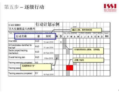 第五步-逐級行動:行動是目標方針展開最重要的部分,項目管理可以幫助我們進行更好的跟蹤行動計劃。當中一定要明確誰做什么,什么時候做,什么時候要核查進展,還可以用顏色進行表示,綠的表示一切正常,紅的表示不正常,其中可以明確知道哪些進行正常哪些進行不正常。