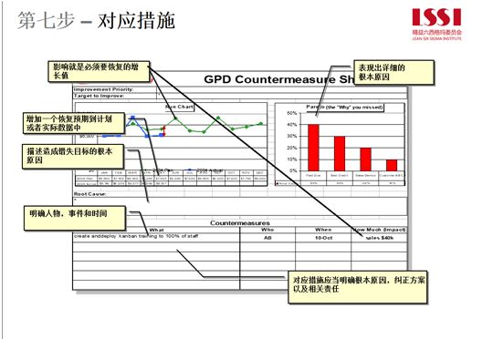 第七步-對策:如果一個行動、一個流程沒有達到目標,要進行分析,可以用帕累托、五個為什么等工具分析。精益當中有很多方法,找到根本原因,采取糾正措施,預防再次發生。如果市場發生重大變化,如何防止止損并步入正軌,還要設立負責人和完成日期。