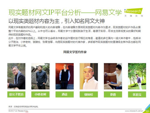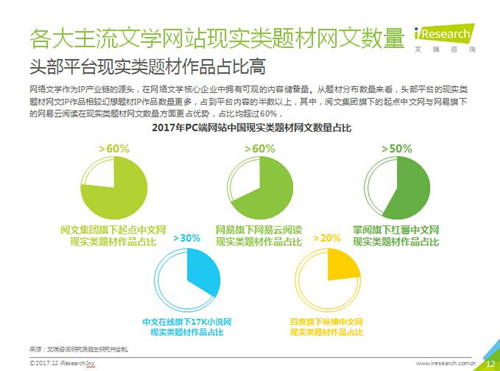 近日,國內(nèi)知名權(quán)威第三方數(shù)據(jù)調(diào)研機(jī)構(gòu)艾瑞咨詢發(fā)布了《2017年中國現(xiàn)實(shí)類題材網(wǎng)絡(luò)文學(xué)IP價值研究報(bào)告》,該報(bào)告以中國網(wǎng)絡(luò)文學(xué)中的現(xiàn)實(shí)類題材IP為研究視角,盤點(diǎn)了該類題材的發(fā)展現(xiàn)狀與平臺策略,也梳理了2017-18年內(nèi)各大平臺的潛力現(xiàn)實(shí)類題材IP。報(bào)告指出:在市場端,現(xiàn)實(shí)類題材網(wǎng)文IP的商業(yè)化進(jìn)程完善,已打通泛娛樂全產(chǎn)業(yè)鏈,讀者也認(rèn)為現(xiàn)實(shí)類題材作品的故事背景更貼近生活,更具有真實(shí)感,這些都讓其在網(wǎng)絡(luò)文學(xué)題材中的優(yōu)勢逐漸凸顯;而在行業(yè)端,在相關(guān)政策對現(xiàn)實(shí)題材的大力支持下,閱文集團(tuán)、網(wǎng)易文學(xué)等一線內(nèi)容平臺紛紛推出強(qiáng)勢舉措;在報(bào)告評估的2017-2018年度優(yōu)秀現(xiàn)實(shí)類題材網(wǎng)文IP案例中,《方外:消失的八門》、《罪惡調(diào)查局》、《我的月供男友》和《死神的哈士奇》等共計(jì)6部作品被推薦成為年度價值IP案例。