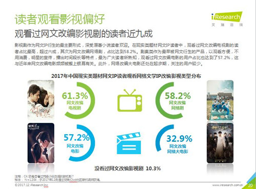 艾瑞統(tǒng)計(jì)表明,影視劇作為網(wǎng)文IP衍生的最主要形式,深受原著小說讀者歡迎。在現(xiàn)實(shí)類題材網(wǎng)文IP讀者中,觀看過網(wǎng)文改編電視劇的讀者占比最高,超過六成,其次為網(wǎng)文改編網(wǎng)絡(luò)劇,占比達(dá)到58.2%。劇集類作為最早被網(wǎng)文衍生的產(chǎn)品,以觀看方便,不用消費(fèi),明星的宣傳,播出時間段長等特點(diǎn),最為廣大讀者所熟知,小說改編的電視劇在PC端及移動端的排行榜Top10中也都占到了7成。觀看過網(wǎng)文改編電影的用戶占比也達(dá)到了57.2%,這與近年來網(wǎng)文改編電影頻頻被搬上銀幕有關(guān),如《從你的全世界路過》、《致青春》、《匆匆那年》等,其中青春校園類題材電影受年輕人青睞,原著粉絲對未來網(wǎng)絡(luò)小說改編電影也表現(xiàn)出高度的熱情和期待。[NextPage] 此外,根據(jù)調(diào)研顯示,現(xiàn)實(shí)類題材網(wǎng)文IP讀者對于自己喜愛的網(wǎng)文IP改編影視劇持有較高的付費(fèi)意愿,具體表現(xiàn)為購買電影票及視頻網(wǎng)站會員消費(fèi)意愿更高。