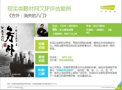 在報(bào)告的最后,艾瑞列舉了六部有望在2018年度成為最具價值的現(xiàn)實(shí)主義題材IP案例,并從內(nèi)容價值、粉絲價值和作者口碑、推薦改編和衍生建議等多方面進(jìn)行了詳述。這6部作品包括徐公子勝治的《方外:消失的八門》、驍騎校的《罪惡調(diào)查局》、楊千紫的《我的月供男友》、君不賤的《死神的哈士奇》、人間武庫的《逆流純真年代》和丁墨的《烏云遇皎月》。其中,徐公子勝治的《方外:消失的八門》由網(wǎng)易云閱讀、掌閱、書旗等五大閱讀平臺同步首發(fā),目前影視與游戲開發(fā)計(jì)劃已定,依靠產(chǎn)業(yè)聯(lián)動提升IP效應(yīng),艾瑞預(yù)計(jì),其影響力有望觸達(dá)1.3億人。