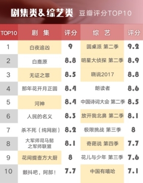 視頻網站的自制內容不僅是數量爆發,同時在口碑質量、傳播熱度等方面自制內容同樣收獲頗豐,既包括綜藝節目也有電視劇集。截止9月,上線的影視劇內容豆瓣評分TOP10中,劇集方面占4席、綜藝類占6席,自制內容的網站評分與衛視上星節目幾乎不相上下。