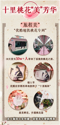 二是多方聯動”大組局”對用戶次元壁的穿越。《三生三世》在2017年開年布下的一系列桃花局,包括開年手機上突然跳出來的挑花簽,突然有一天北京突然出現了一個桃花專列,又過了一段時間,2月14日,西單地鐵站變成了十里桃林。很多人在那里拍照,在那里玩。在劇情播出中,用戶又發現百草味的桃花糕還挺好吃的,瀘州老窖的桃花醉真的能醉人,到閑魚上,用戶又發瑞可競拍夜華和白淺的服裝,還不貴只要幾千塊錢就買到,到超市一看,貨架上擺放著味全桃花飲,上面的文字似乎很符合自己當下的心情……這一系列從內容出發通過場景連接到用戶情緒,最后實現了對用戶次元壁的穿越,讓原著粉,地鐵族,粉紅女、真愛黨等不同次元壁的用戶,不約而同的卷入到同一個話題中,最終形成全社會“不說三生三世就OUT”的現象。而這一挑花局的背后,正是內容方,藝人方,粉絲方、媒體方、品牌方和阿里大文娛六方聯動的結果。