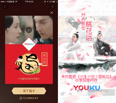 ??得益于阿里大文娛生態加持,優酷的宣推確實能觸達更多阿里系的資源。如在春節期間支付寶“集福卡”、手淘的pop-layer產品(一種基于app端的交互特效)、UC、微博、餓了么、飛豬等資源全線曝光。此外,在前幾天被大家津津樂道的白淺戲服的拍賣,也是優酷聯動閑魚的推廣。