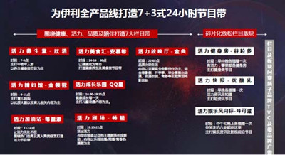 為了匹配伊利全產品線的市場推廣需求,樂視大屏圍繞“健康,活力,品質及陪伴”為伊利“活力視界”頻道打造了“7+3式”24小時節目帶。同時根據年輕人群的收視行為及喜好設計頻道中的具體節目時間和內容,每一個欄目都會整合伊利的產品進行播出。