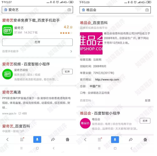 知曉程序也用自己常用的智能小程序進(jìn)行了測(cè)試。在搜索唯品會(huì)、愛(ài)奇藝、愛(ài)說(shuō)唱、虎牙直播時(shí),這幾個(gè)智能小程序在搜索結(jié)果頁(yè)面中所處的位置都排在前五。
