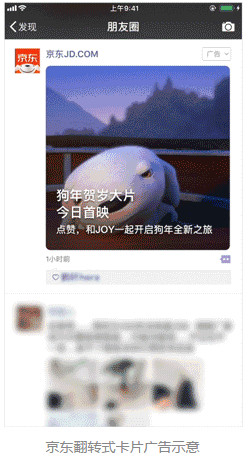 另一方面,點贊之后,驚喜出現(xiàn)——廣告翻轉(zhuǎn)到背面,進(jìn)入京東小程序,不僅可以選購京東與百余家品牌聯(lián)合推出的JOY形象狗年定制款商品,“把JOY帶回家”,還可以購買拼手氣京東E卡,像紅包一樣發(fā)到微信群里讓好友們?nèi)尅?/span>