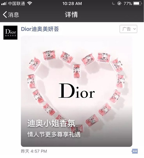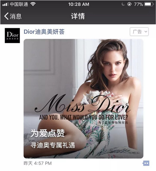 而迪奧則是用正面鏈接Minisite專享情人節(jié)刻字服務(wù)、背面視頻專享Dior禮品卡情人節(jié)臻禮彩蛋的方式:正面,“為了愛,你將如何付出?點贊見證迪奧小姐無所畏懼的愛”文案來吸引互動,背面則用限量產(chǎn)品,讓用戶產(chǎn)生購買興趣。