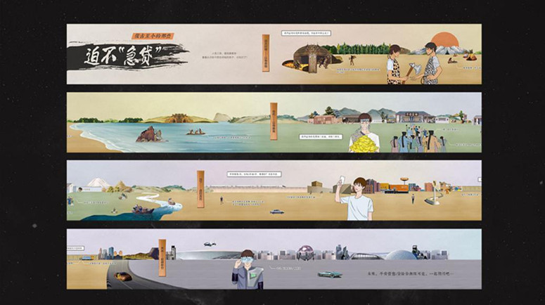 由此可見,借長圖文之風(fēng),在游戲互動的同時,對消費者進(jìn)行關(guān)于金融的發(fā)展、貸款趨勢等知識的科普是較有效的傳播方式。以貨幣的演變史為時間長軸,一張長圖展現(xiàn)各個時期人們不同的急貸方式和場景。在趣味普及知識的同時,讓消費者理解i貸帶來的生活便利。