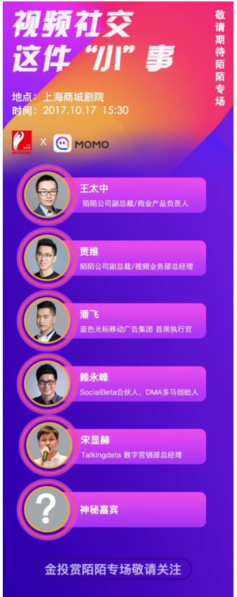 金投賞(ROI Festival)是全球第一個商業創意獎項,亞洲規模最大的創意節之一,被譽為“中國商業創意領域的達沃斯峰會”。第十屆金投賞國際創意節將于2017年10月16日-19日在上海商城劇院舉行,國內多家知名營銷企業及創意人將參會。陌陌會在10月17日下午獻上金投賞首秀,開設專場論壇,與業內專業人士共同探討視頻社交這件“小”事。