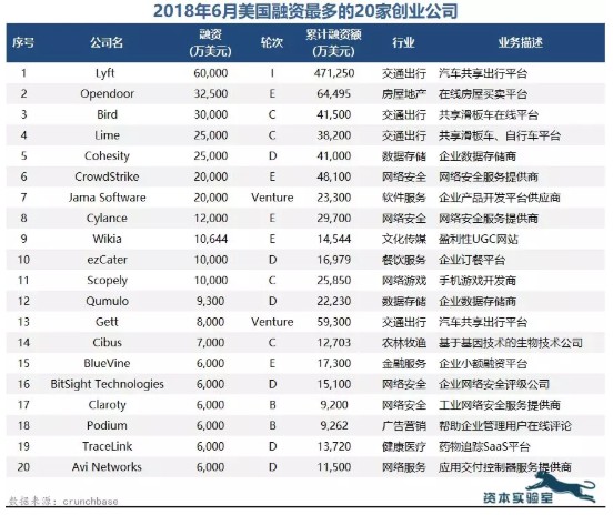 根據CrunchBase的統計數據顯示,6月份,美國融資最多的20家企業的融資額超過31億美元。