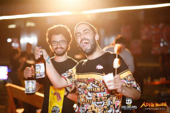(外國友人盡情享受一口啤酒一口周黑鴨的放松時刻)