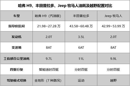 值得一提的是,在哈弗H9、普拉多和牧馬人三款主流硬派越野SUV的對(duì)比中,我們可以看到,即便是哈弗H9接近2.4噸的自重是三款車型當(dāng)中最重的,但它的綜合油耗仍然喜人。
