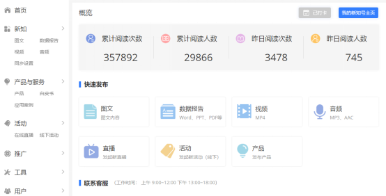 市場推廣運營體系提供內容運營、直播運營、活動運營、SMS短信運營等多種運營方式。文章、直播與活動將會免費實時分發至商業新知平臺,優質文章經審核后收錄至新知庫,依托知識圖譜的精準分發實現持續的營銷效果。