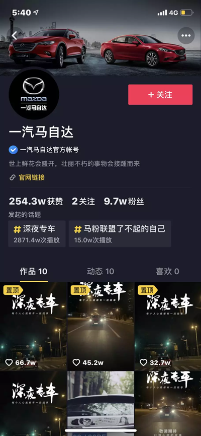 在抖音,優質的豎屏短視頻內容可以快速幫助品牌藍V實現聯動。面對這一流量價值洼地,很多汽車品牌在新產品上市之初,會將抖音作為曝光的重要平臺。一汽馬自達利用《深夜專車》實現了藍V精細化運營,并通過優質的短視頻內容向關注品牌的車主、車迷傳遞著品牌理念。