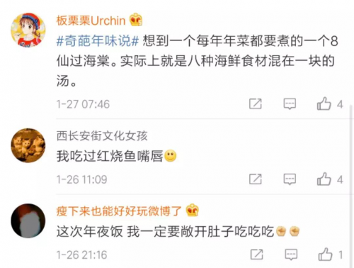 這次的#奇葩年味說(shuō)#,不僅從多渠道發(fā)力,同時(shí)也與京東到家、百威啤酒、綠盒王老吉、好時(shí)巧克力、海天招牌拌飯醬、泰森等品牌藍(lán)V聯(lián)動(dòng)造勢(shì),將內(nèi)容傳播效果Max! 截至目前,該話題引起了網(wǎng)友的廣泛熱議,一大波有趣的評(píng)論接踵而來(lái)......