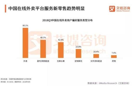 新零售成為在線外賣平臺服務新趨勢:第三季度調查中,80.1%的用戶偏好使用在線外賣平臺的外賣服務;48.1%的用戶偏好使用在線外賣平臺的超市、網購配送服務;42.0%的用戶品偏好使用在線外賣平臺的生鮮水果服務;