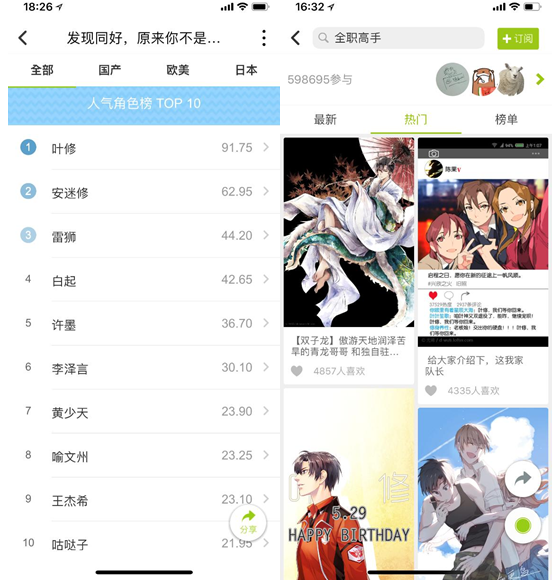 近日,《全職高手》中的靈魂角色葉修的生日應援,刷爆微博、LOFTER、B站等各大平臺,#葉修#微博超話閱讀量截至日前已超過5.8億,網易LOFTER站內葉修更是登頂LOFTER人氣角色榜單,位列第一。
