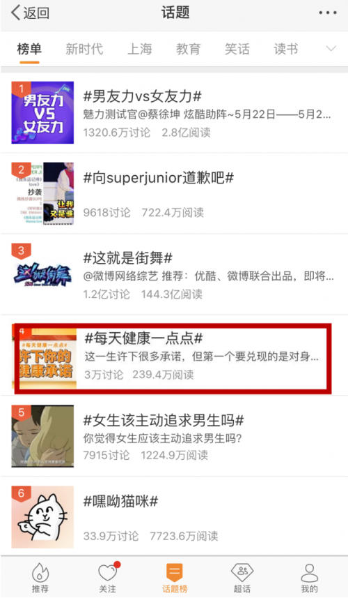 截止至5月25日,#每天健康一點點#微博話題已獲得631萬+閱讀量,3.5萬討論量,并躋身話題榜第四名,堪稱一場漂亮的營銷戰役。