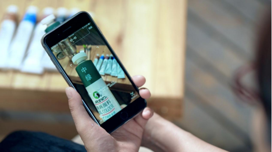 據畫展負責人介紹,在視障畫家創作過程中,科技的助力讓創作更加便捷。例如,在視障畫家作畫的過程中,使用手機QQ“掃一掃”,就可以對繪畫顏料包裝文字進行識別并語音播報,這對于他們辨別顏料色彩有很大的幫助。