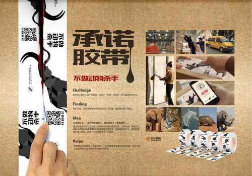 2016年,鳳凰網、蘇寧易購、生米組成聯合打造——承諾膠帶(The Tape Pledge)項目,以蘇寧易購龐大的物流網絡為承載渠道,倡導消費者對野生動物制品說“不”。該項目利用特殊的夾層工藝膠帶為互動介質,將多種因遭盜獵的動物圖形作為溝通內容。在消費者在劃開膠帶時,微量紅色顏料像血液般從象牙、鯊魚鰭和犀牛角等處滲透出來,以極強的視覺沖擊來警醒世人。另外,用戶還可通過膠帶上的二維碼,進入H5頁面瀏覽這些動物對環境保護和人類生存的重要性信息,在頁面的最后,還設計了按下承諾“不購買,不作動物殺手”的按鍵就可轉發信息的小功能,在加強認同感的同時,也將保護動物的善意傳遞給其他人。