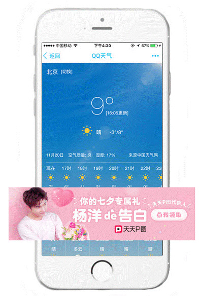 ??天天P圖在今年七夕的時候,策劃了“楊洋de表白”這樣的活動,關注七夕節的年輕女性居多,而楊洋的粉絲也是具有相似的屬性。所以他們把與楊洋P情侶照的邀請投放在了手機QQ、手機QQ瀏覽器和QQ空間等場景。