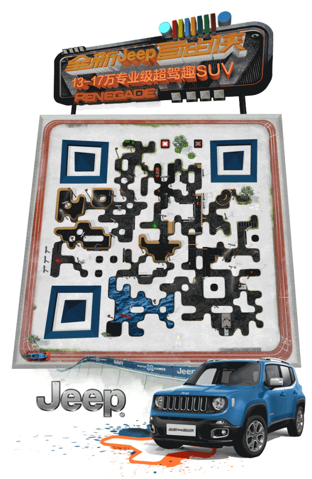 無探索,不創(chuàng)意。首先打破一碼到底的常規(guī),為每一款車型專屬定制。如用極限主題公園定義主打駕趣的Jeep自由俠,以街球、滑板、摩托艇等元素豐富畫面,并使用三維建模技術(shù)與二維碼的特殊圖形融為一體,使整個(gè)碼有如微觀世界一般生動(dòng),而不只是生硬的在碼上添加素材。