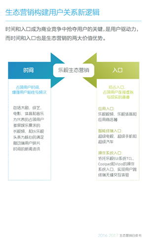 因此,在互聯互通的全球互聯網發展的大環境下,整個互聯網行業將迎來一個生態時代。任何一個細分領域單憑一個企業孤軍奮戰已經行不通了,未來的競爭將不僅僅局限于某個產品或者某個平臺的競爭,而是拓展到生態鏈各環節整合協同能力的競爭,因此在生殺予奪的商戰中,開放閉環生態圈,謀求與相關企業的合作共贏,開放用戶平臺資源成為了優化生態系統的必經之路。在這一視角下,樂視選擇“開放閉環生態系統”,邀請合作伙伴甚至競爭對手一同構建生態圈,提出“由垂直整合的閉環生態系統和橫向擴展的開放生態圈共同構成的完整系統”實為明智之舉。