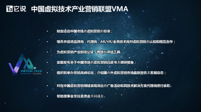 它說創始人來自國內知名4A公司和互聯網公司,團隊以廣告、公關和互聯網人為主,目前它說信息正在牽頭組織建立VMA虛擬技術產業營銷聯盟,在產業層面加快中國VR技術公司在中國產業升級中發揮自身更大的作用。