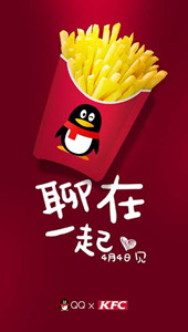QQ、肯德基,看起來(lái)相距甚遠(yuǎn)的兩者能有什么聯(lián)系嗎?4月3日,QQ官方手機(jī)QQ官方微博發(fā)出三張含有QQ與KFC經(jīng)典快餐結(jié)合,以“在一起”為主題的懸念海報(bào),并對(duì)用戶表示“4月4日見(jiàn)”。通過(guò)海報(bào)對(duì)食品元素的展示,猜測(cè)此次QQ與KFC雙方可能會(huì)要開(kāi)展深度合作,甚至不僅僅是品牌方面,而是產(chǎn)品上的深度合作。