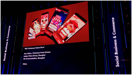 在剛剛結束的第66屆戛納國際創意節上,肯德基中國憑借“圣誕口袋炸雞店整合營銷”及“口袋炸雞店”項目喜獲三座戛納金獅。其中,肯德基以“圣誕口袋炸雞店整合營銷”獲得創意電商金獅獎,并以“口袋炸雞店”獲移動支付解決方案及社交電商兩座金獅獎,成為今年大中華區獲得獎項最多的品牌。
