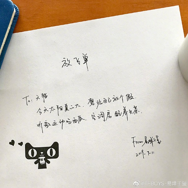 幾天前,易烊千璽在個人微博上曬出了自己手寫給天貓的打油詩,“今天太陽真的大,想給自己放個假,放飛單請查收”,隨后手動艾特了天貓。截至發稿,這條“小小”的“放飛單”轉評超過了百萬,“與千璽理想生活一夏”話題閱讀更是超過了10億。