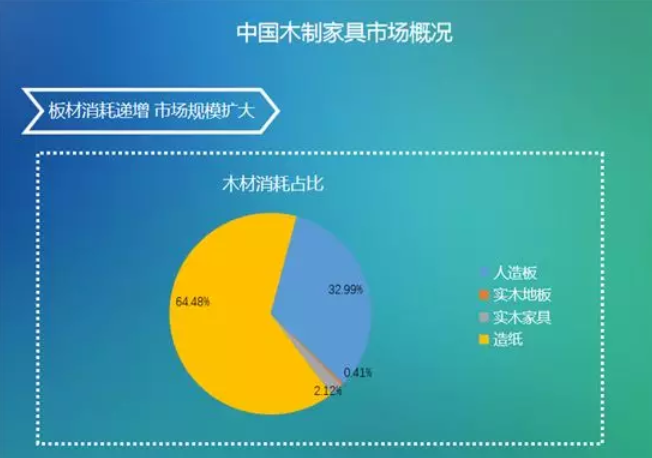 目前中國家居市場每年消耗的資源成遞增趨勢。在我國的木材消耗中,來自家裝及家居領域的消耗占比較大。據中國林產工業協會和前瞻產業研究院數據顯示,在每年的木材消耗中,家裝家居領域的占比持續走高,其中,人造板占比最高,為32.99%,而實木類家具產品總和占比則不足3%。