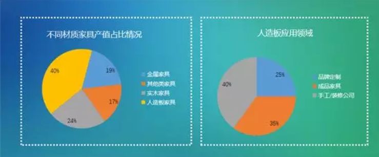 在家具總產值中,木家具的比例為64%,其中,人造板家具占40%,實木家具24%。金屬家具和其他類家具分別占19%、17%。在人造板應用領域當中,品牌定制占25%,成品家具占35%,手工/裝修公司占40%。
