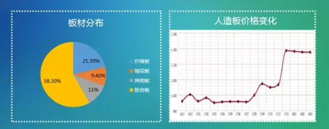 在板材分布中,膠合板占比最高,占58.3%,其次是纖維板,占21.3%,刨花板和其他板分別占9.4%、11%。2016年-2018年,人造板價格持續攀升,產品結構優化與綠色創新升級成為了企業轉型升級的核心之一。