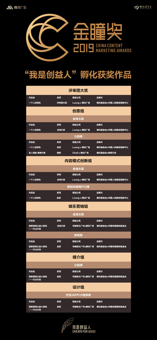 5月25日,由廣告門主辦的2019金瞳內容盛典暨頒獎典禮在北京如期舉行。騰訊廣告狂攬38項金瞳獎,其中由 “我是創益人”公益廣告大賽孵化的作品,一舉包攬了4項重量級大獎共10座金瞳獎杯,交出了一份令人滿意的答卷。