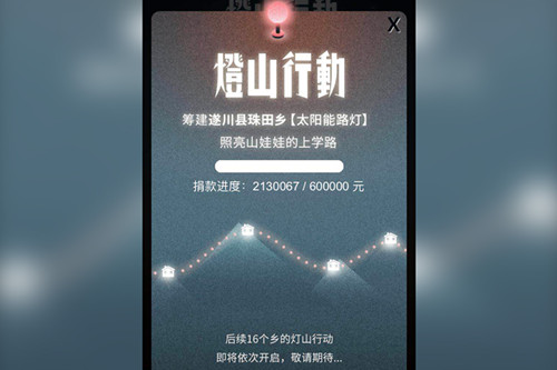 首款微信公益小游戲《燈山行動》3日內打動128.5萬體驗用戶,募捐金額超200萬,將幫助多個偏遠山村修建路燈