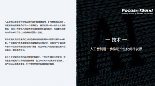 從技術角度出發,人工智能在數字營銷領域為營銷提供全鏈路支持,多場景數據聯通下,將更精準的預測用戶的下一個場景行為,真正實現一對一的個性化精準營銷,個性化郵件進一步發展;