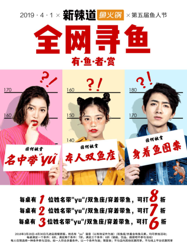 3月28日,新辣道魚(yú)火鍋在全國(guó)范圍內(nèi)發(fā)起了全網(wǎng)尋魚(yú)活動(dòng),只要你的姓名中有yu或雙魚(yú)座或身上有魚(yú)元素,每桌有1位可打8折,2位可打7折,3位可打6折,這個(gè)優(yōu)惠力度可是不小。不過(guò),活動(dòng)條件看似簡(jiǎn)單,不過(guò)還是有點(diǎn)門(mén)檻的,魚(yú)元素可不是每個(gè)人身上都有,要想打折似乎也沒(méi)那么簡(jiǎn)單。