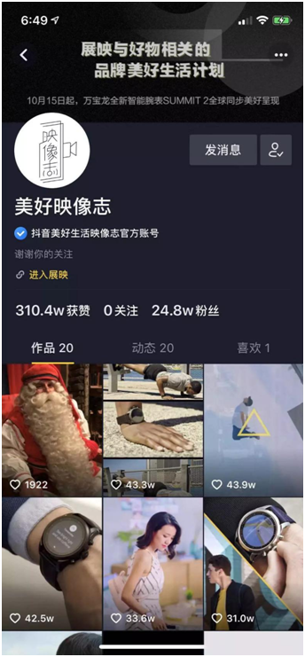 以萬寶龍為例。抖音的內容共建IP @美好映像志 在第一季開創性的展映中,推出了為香奈兒J12 腕表精心制作的12支視頻。2018年10月15日,@美好映像志 第二季展映來了,這次的主角是萬寶龍SUMMIT 2智能腕表。圍繞SUMMIT 2#不止向前#的品牌理念,抖音@美好映像志 在10月15日~20日期間共更新了六支短視頻。