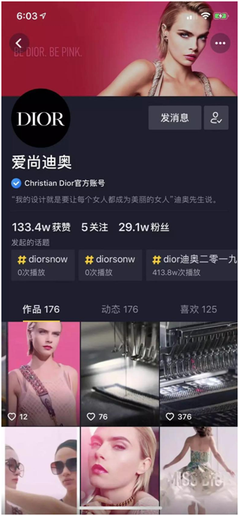 迪奧是最早與抖音合作的奢侈大牌,早在2018年3月份,抖音內測藍V賬號時,迪奧就成為4個參與內測的品牌之一,一直在進行藍V的精細化運營。