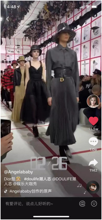 比如迪奧,在巴黎時裝周期間,利用自己的代言人@angleababy 發布大量迪奧品牌時裝秀和花絮視頻,獲得很好點贊量和互動量,取得很好的傳播效果。