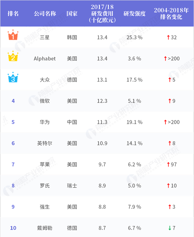 近日公布的2018年全球企業研發投入排行榜中,三星以134億歐元的研發費用位居第一。美國在前50的榜單中占領22席位,為所有國家中最多。德國位居其次,占領9席。