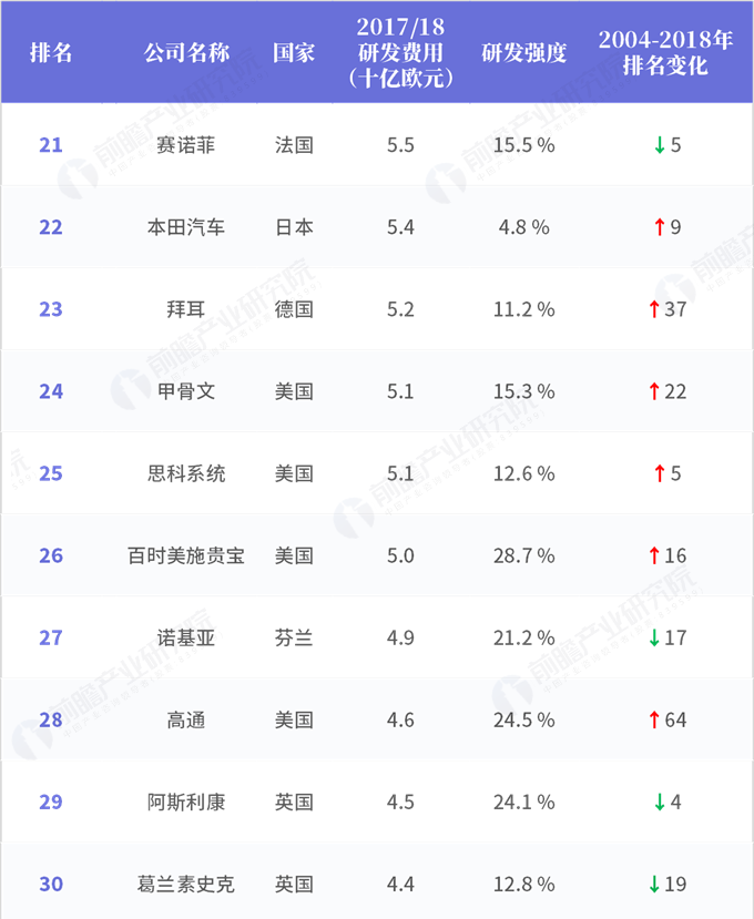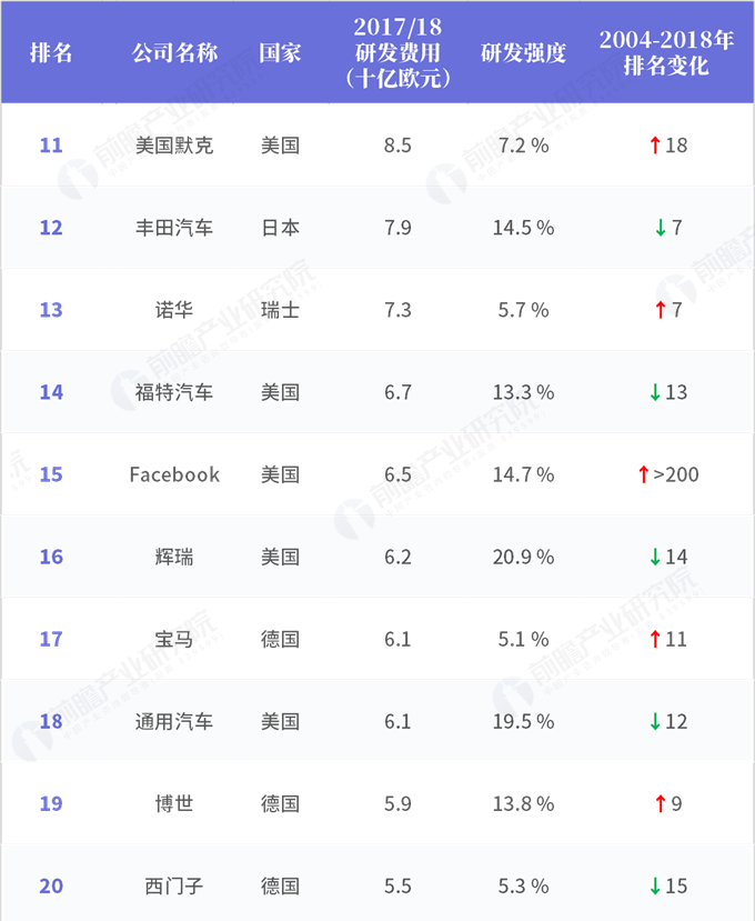 2018年全球企業研發投入排行榜(五)
