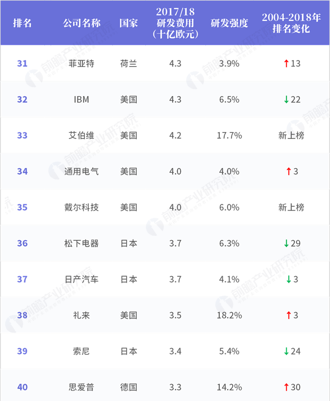 2018年全球企業研發投入排行榜(四)