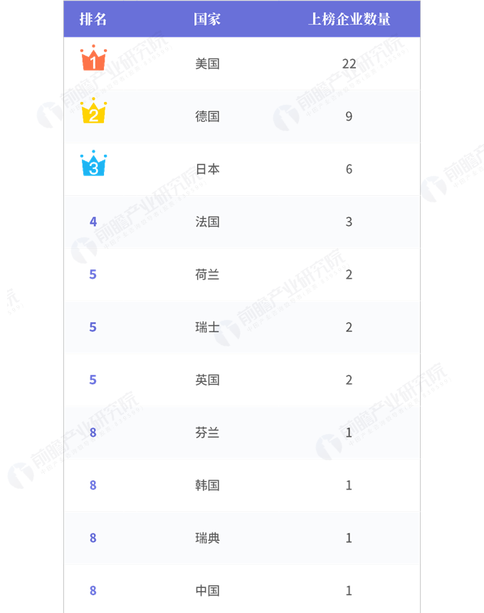 美國以22家企業上榜占據數量上的絕對優勢。德國排名第二,有9家企業上榜,排名第三的日本有6家企業上榜。