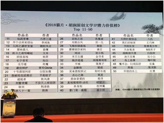12月20日,胡潤研究院攜手IP版權(quán)運營機構(gòu)貓片,在北京聯(lián)合發(fā)布了《2018貓片·胡潤原創(chuàng)文學(xué)IP價值榜》,100個最具價值的中國原創(chuàng)文學(xué)IP上榜。同時,還發(fā)布了《2018貓片·胡潤原創(chuàng)文學(xué)IP潛力價值榜》和《2018 貓片·胡潤原創(chuàng)動漫IP價值榜》。