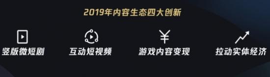 講完升級我們講創新,剛才講到了整個內容創作的升級,2019年大膽的推測,整個行業內容生態的幾個創新,一個是豎版的微短劇,互動短視頻,游戲內容的變現,還有是拉動實體消費。